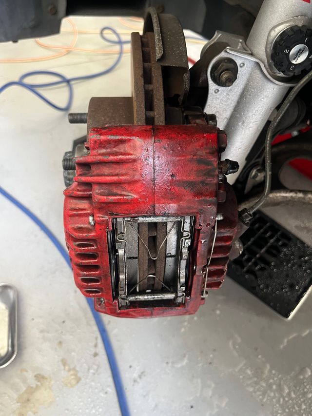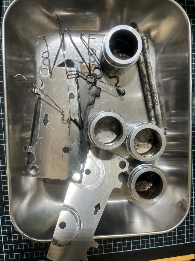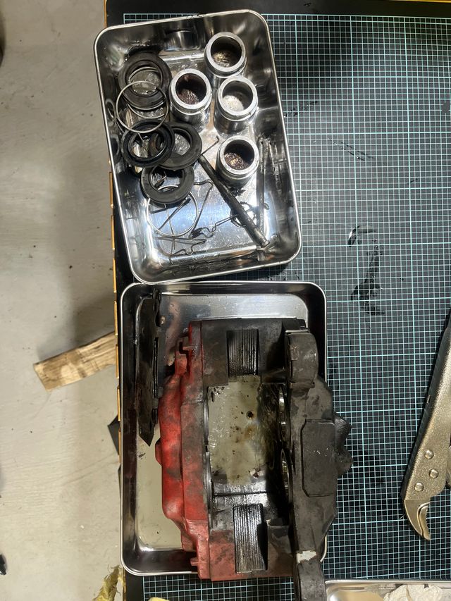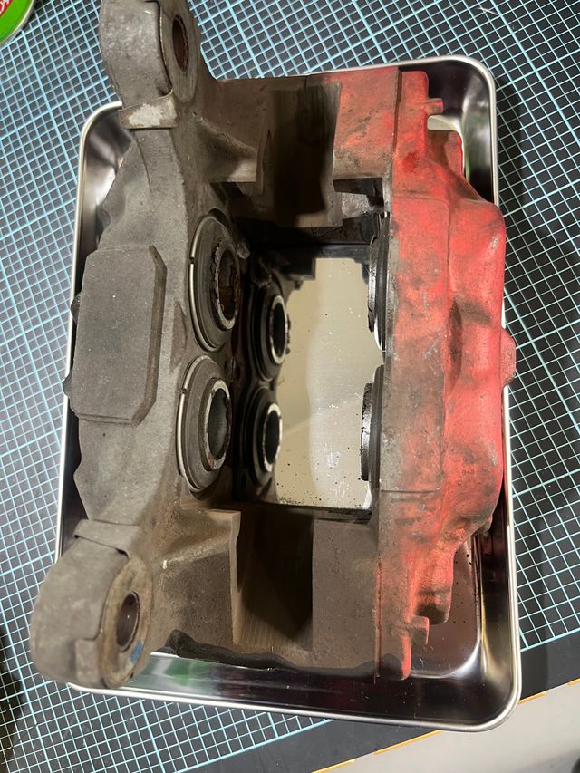 前回の続きでフロントの分解整備となります。リアのようにピストンブーツの破れや固着はないのですが、分解整備は14年ぶりなので行います。リアに比べるとブレーキダストも比較的少なく部品点数も少ないので簡単な筈ですがピストン外しが苦手です。FC3Sのフロントは対向4POTキャリパーなのでピストンが4つあります。このピストンをエアー圧で押し出し外すのですが、中々4本同時にピストンシールから外れません。少しでもタイミングが悪いと片側だけピストンが抜けるのでエアー圧が抜けてしまいます。今回は強引(プライヤー等で引張る等)に外すことはなく丁寧に作業してみました。ブレーキピストンツール総称?(よくあるピストン戻しSST)を本来の戻しに使うのではなく逆にピストンのストッパーのように使います。対向ピストンが少しだけ出る幅にSSTを設定しエアーで押し出します。それを繰り返すと対向のバランスが崩れて来るのでピストンの出が良い方に適切な幅のソケット(適切であればなんでも可)を挟みSSTの動きを止めてエアー圧をかけると出が悪い方が飛び出します。これを繰り返すと4本同時にピストンが外れます。傷が付く可能性が低いのでおすすめです。この作業の意味が写真もないので分からないと思いますが所有の16mmソケット外径(仕様によってですが)がピストン4本同時排出でした。本業とは関係ないことですが、ご興味のある方はお問い合わせください。後は組み付けるだけなので割愛します。最後に苦手なフルードのエアー抜きです。一人での作業なのでワンマンブリーダー(負圧式)を使用しますが毎度エアーが噛んでいます。やり方が悪いのか物が悪いのか全く理解できませんが仕上げエアー抜き作業が必要になります。安全に関わることなのでとても重要です。