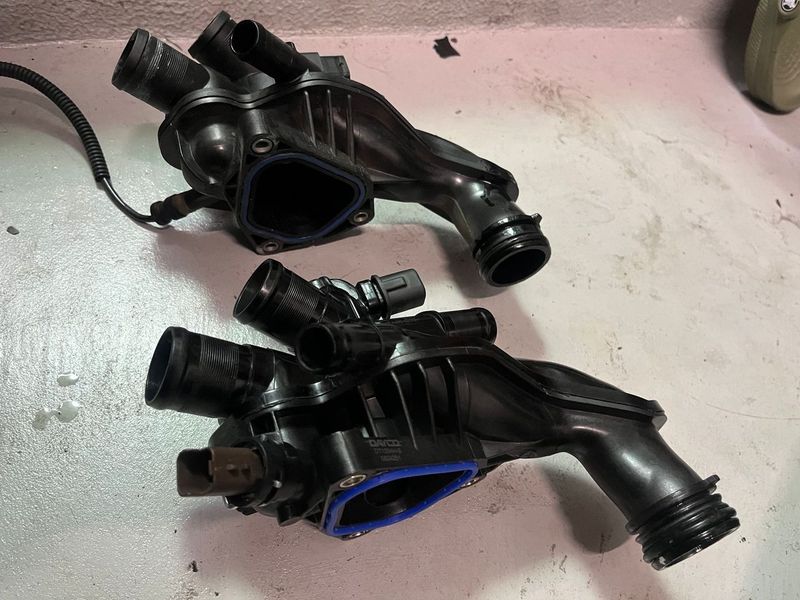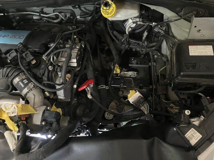 7月のある日エアコンが突然効かなくなりました。猛暑の中、納品中の出来事だったのでとても辛い記憶です。帰宅後、診断機を接続すると3つのエラーコードが出ています。P0597サーモスタット~断線、P0599サーモスタット制御~短絡、P16B3エンジン水温~不一致がエラーとして出ていますが、雰囲気的にサーモスタットハウジングを交換すれば直る感じです。単純にこの車種のハウジングは液漏れトラブルがあるようで、その他にハウジング交換でエアコンが直る(サーモスタットの不良で制御が入るだけだと思います)との事例も見受けられます。部品を調達し作業を開始しますが、サーモスタットハウジングに到達するのにバッテリー・ECU・エアクリBOX・インテークパイプ類・ハーネス他を外してからようやくハウジング外しがスタートします。