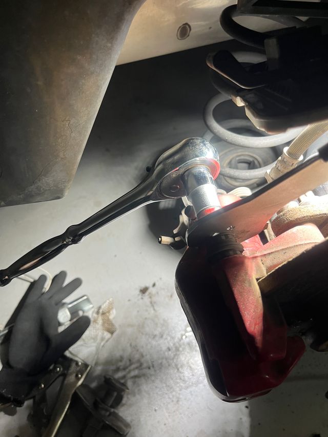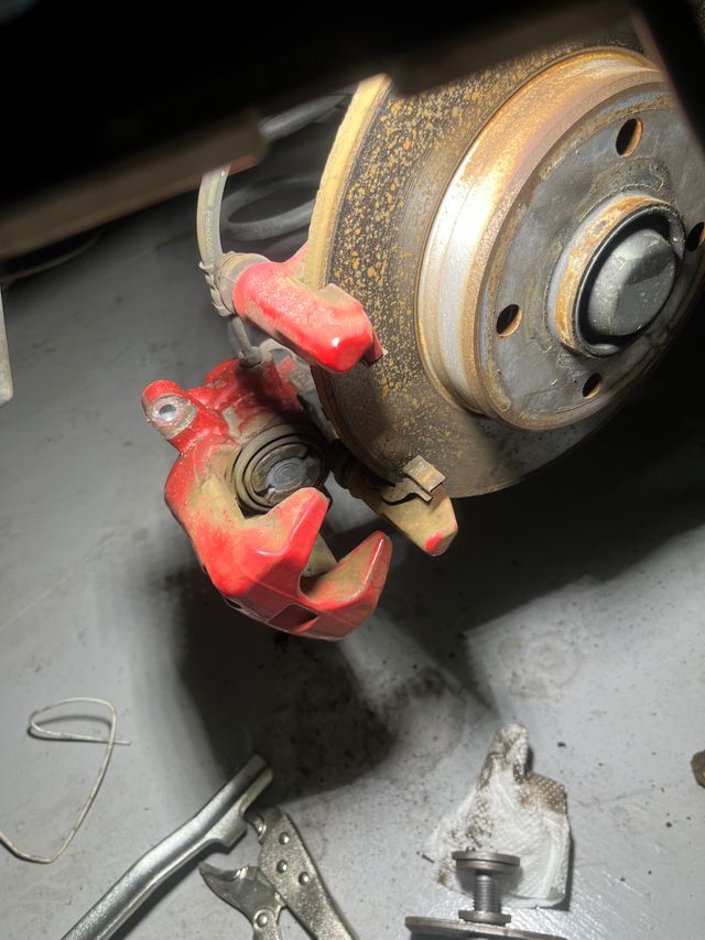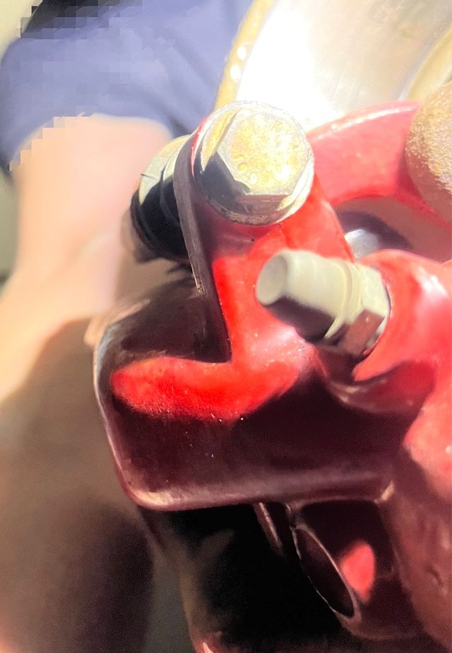 リアパッド交換から始めますが、先日の頭13mmの六角ボルトが外せれば作業は簡単です。 このボルトの締付けトルクが整備書より30Nmとありますので、前回の作業者が過剰トルクで締めていなければ13mmソケットでも緩むと思います。緩み止め剤との兼ね合いもありますが…